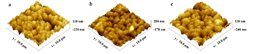 图1.3铝合金基体的AFM图像:(a)未处理;(b)氮气等离子体处理;(c)空气等离子体处理